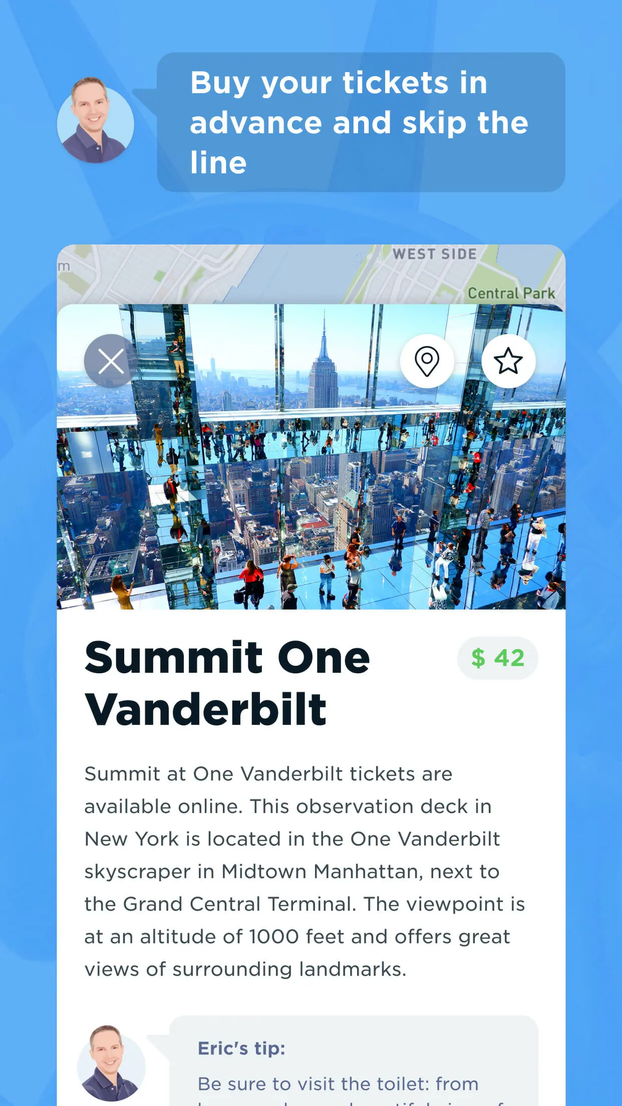 Eric’s New York App is THE app for New York. In this free NYC app, you will find handy maps, information about attractions, walking routes through different neighbourhoods, personal tips, and tickets for everything that you could possibly want to do in New York.