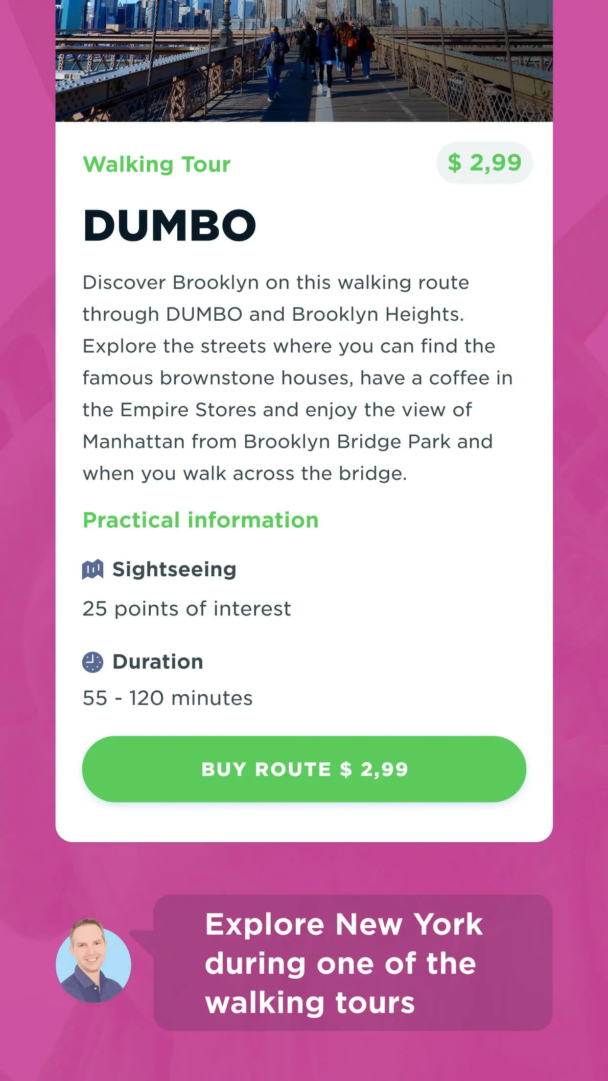 Walk with me through different neighbourhoods in New York with one of my walking routes available in the app. I have developed this so that you can discover the unknown places of the city in addition to the well-known ones. Stroll the streets of SoHo, cross the Brooklyn Bridge, discover Greenpoint and more.